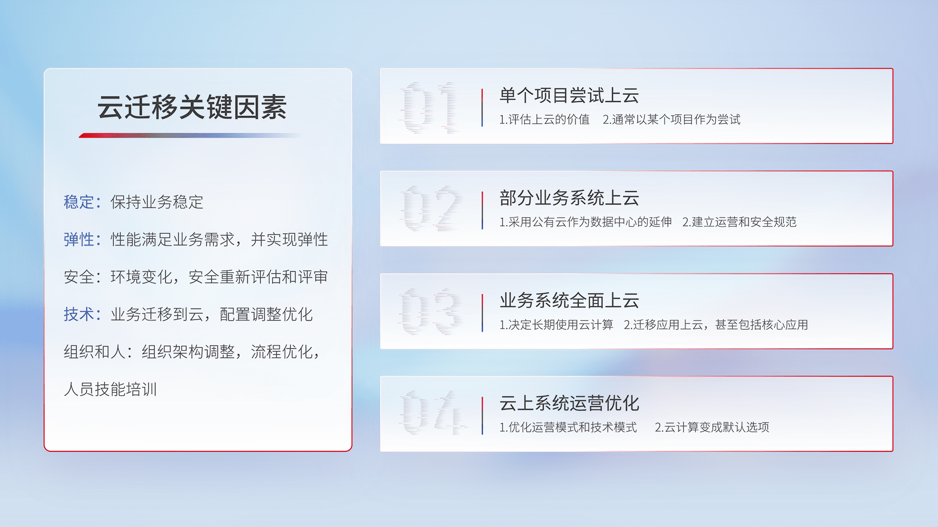 结合实际业务,,,,从规划设计、、、云平台选型、、、、云原生改造、、数据迁移、、、、集成交付,,迁移全过程为客户识别最佳上云路径,,,做好风险识别管理,,设计网络架构、、身份权限、、、、安全审计合规、、、、操作审计、、、、日志审计、、监控告警策略、、、、多站点容灾设计等,,,,对云上基础设施进行整体规划,,,提升IT治理水平,,以满足弹性、、、、高可用、、、高性能的需求。。。