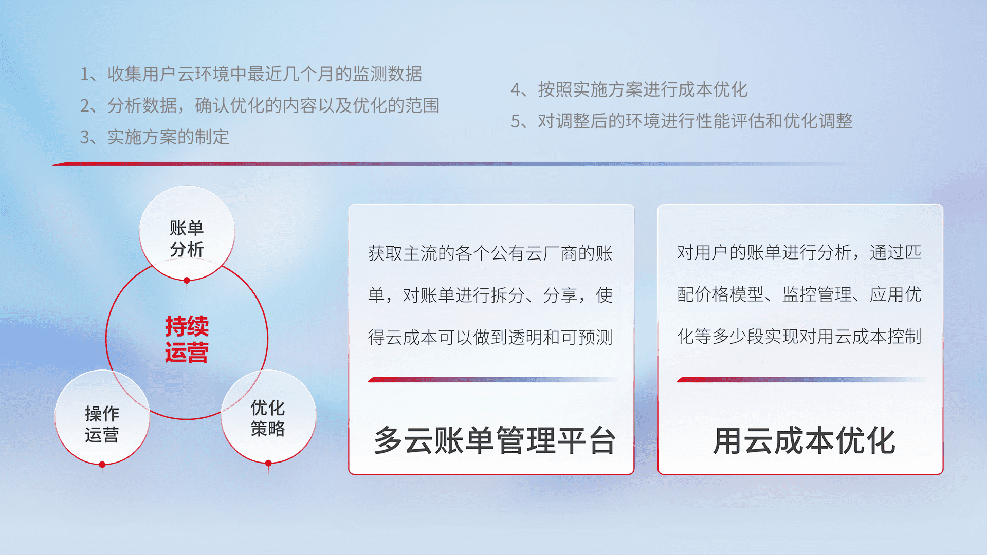 通过多云纳管,,以统一的资源数据模型把客户的云资源进行抽象和封装,,,进而实现对多云资源的统一操作,,保障云资源管理的可靠性、、、稳定性与可用性。。量身定制化运维内容,,,配置、、开发运维、、、补丁管理、、、、备份、、监控、、认证和访问管理、、、、审计和日常巡检等,,,,保障在用云过程中的可靠度,,,稳定度以及高可用率。。。。